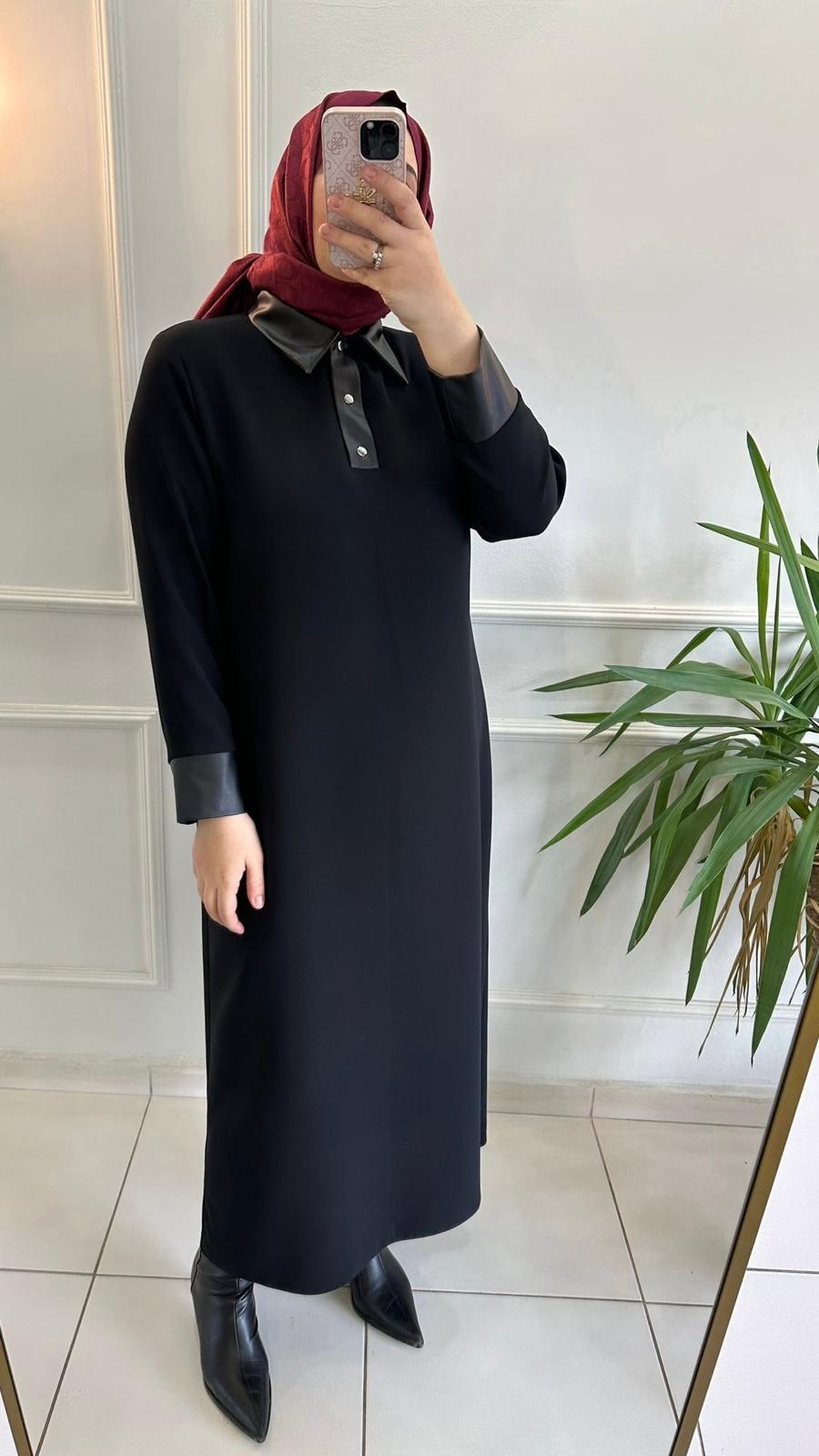 DERİ DETAYLI ELBİSE